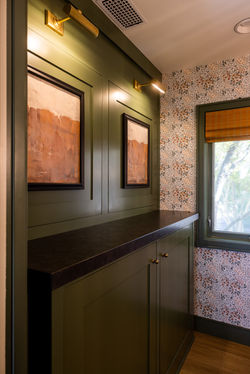 ![]() What was once a closed off room became an ideal space for entertaining, with removing the fireplace and opening up the wall. | ![]() It was in the decor that color emerged. | ![]() Who does't love a hidden laundry room inside a powder room? Behind the lowers are the washer and dryer, and with just a push of the upper panels you will find storage. |